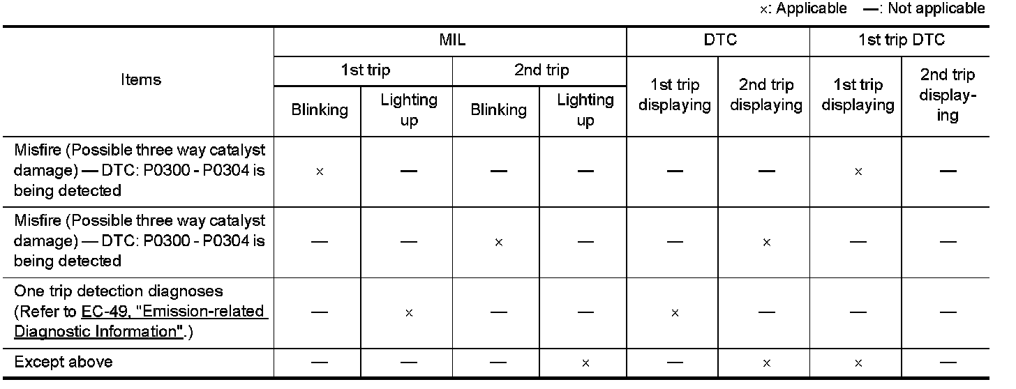 If the same malfunction is detected again during the next drive, the DTC and Freeze Frame data are stored in the ECM memory, and the MIL lights up. The MIL lights up at the same time when the DTC is stored. [2nd trip] The "trip" in the "Two Trip Detection Logic" means a driving mode in which self-diagnosis is performed during vehicle operation. Specific on board diagnostic items will cause the ECM to light up or blink the MIL, and store DTC and Freeze Frame data, even in the 1st trip, as shown below.