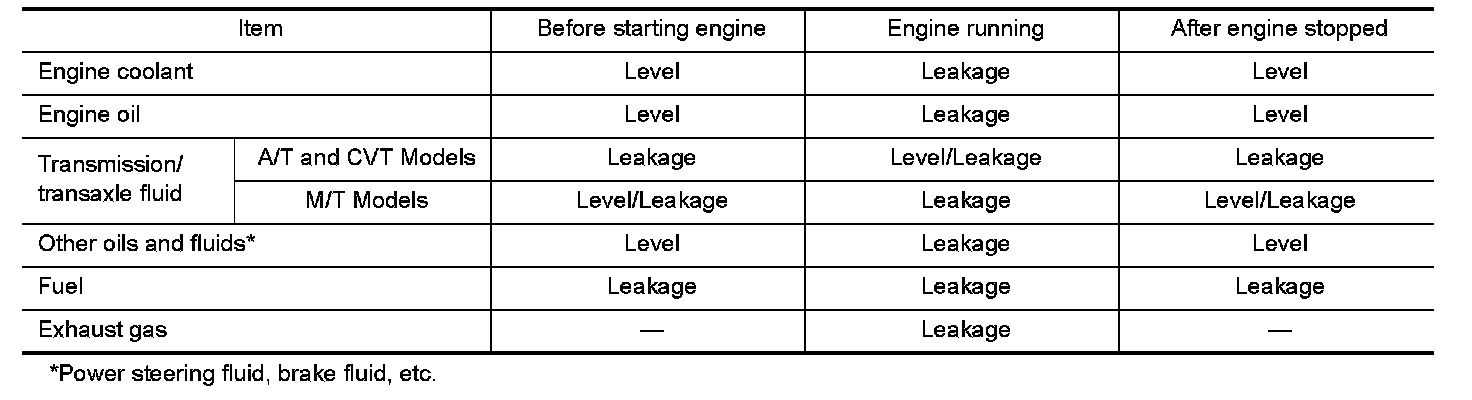 - Warm up engine thoroughly to make sure there is no leakage of fuel, exhaust gas, or any oils/fluids including engine oil and engine coolant.
