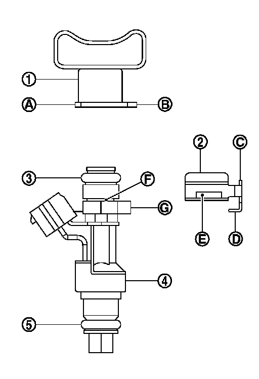- Insert clip so that protrusion (G) of fuel injector matches cutout (D) of clip.