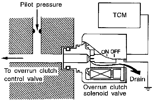The overrun clutch solenoid valve is operated by an ON-OFF signal transmitted by the TCM to provide overrun clutch control (engine brake control).