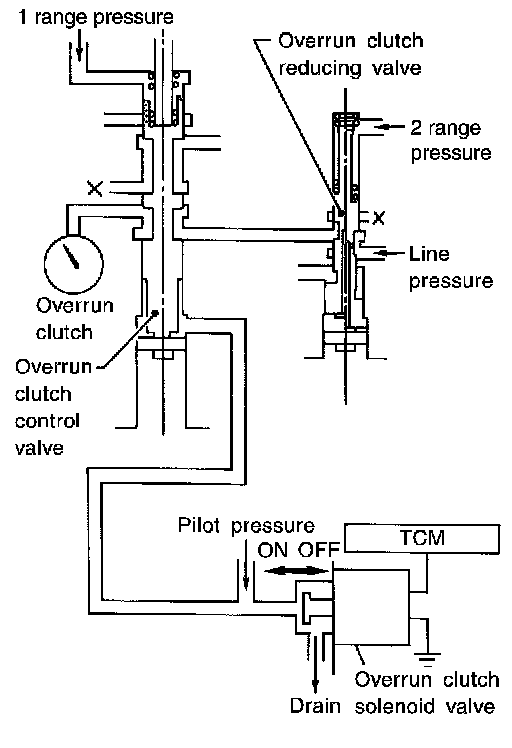 When the solenoid valve is "ON", pilot pressure is applied to the overrun clutch control valve. This pushes up the overrun clutch control valve. The line pressure is then shut off so that the clutch does not engage. Only in "1" position, however, 1 range pressure is applied to overrun clutch control valve, resulting in valve moving downward and clutch engaged.