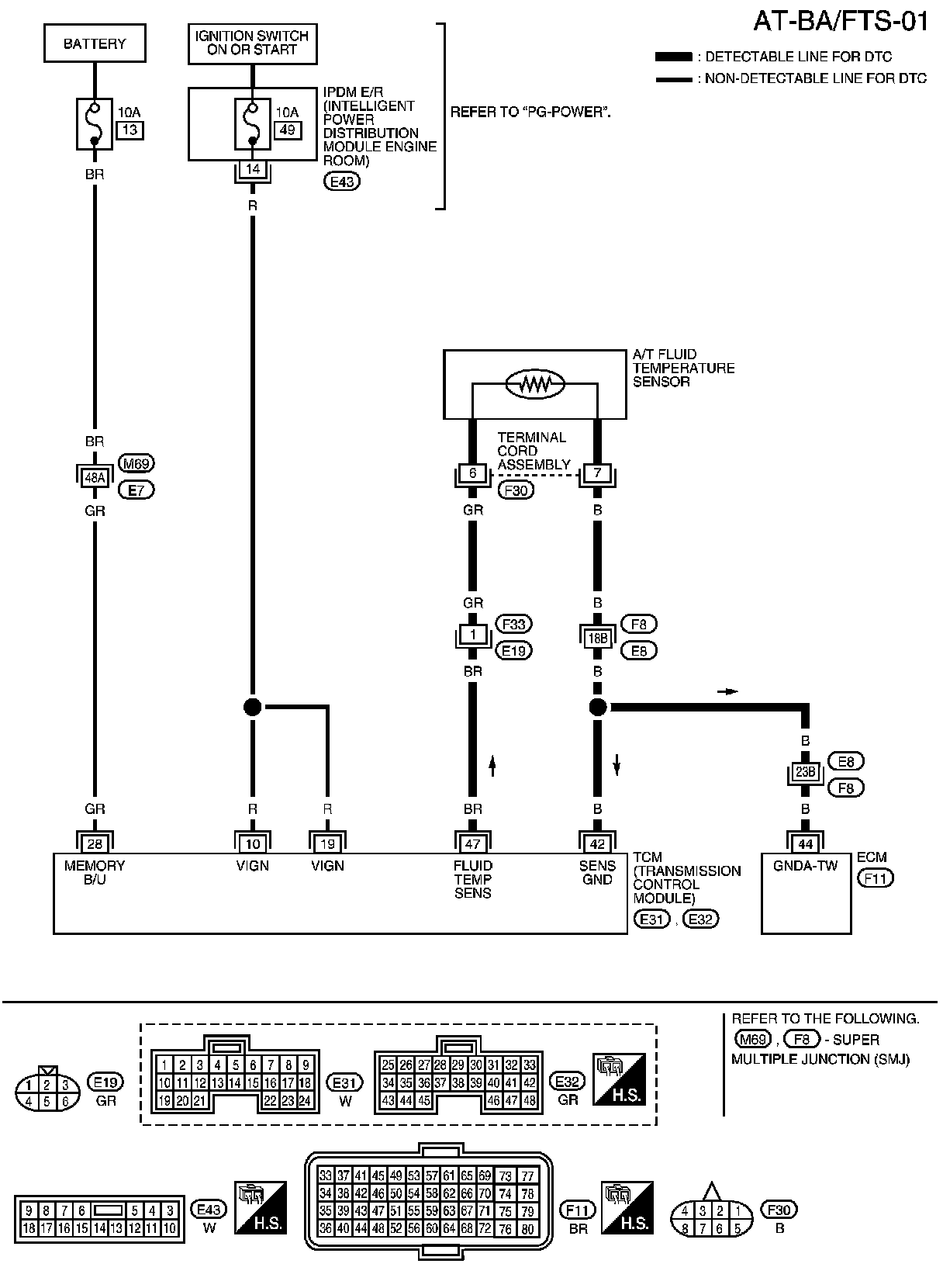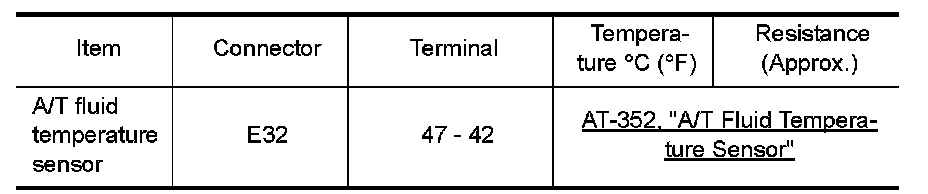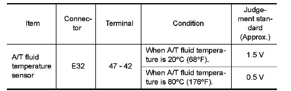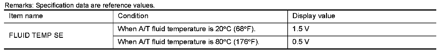 - Diagnostic trouble code "BATT/FLUID TEMP SEN" with CONSULT or 8th judgement flicker without CONSULT is detected when TCM receives an excessively low or high voltage from the sensor.