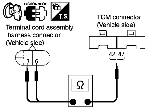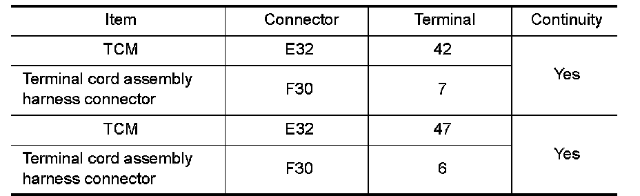3.Check continuity between terminal cord assembly harness connector terminal and TCM connector terminal.