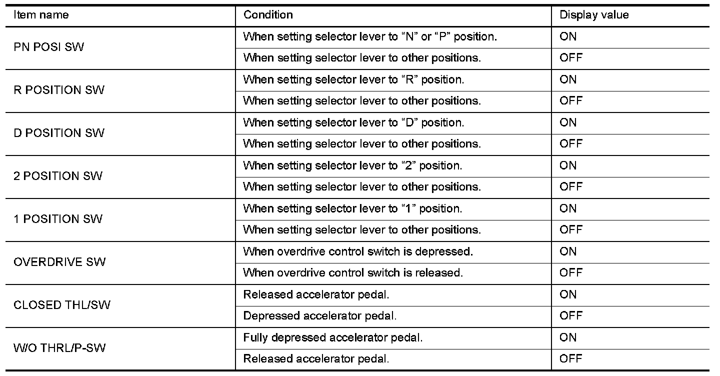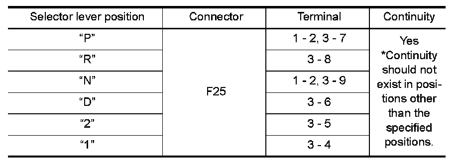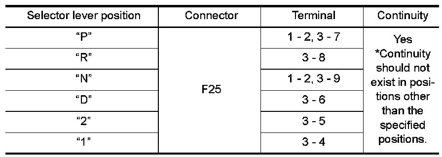 3.Read out "PN", "R", "D", "2" and "1" position switches moving selector lever to each position.
