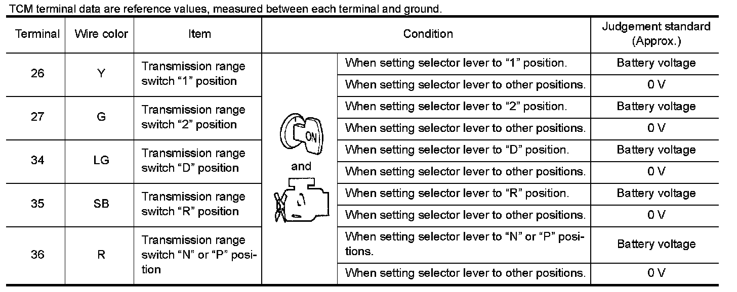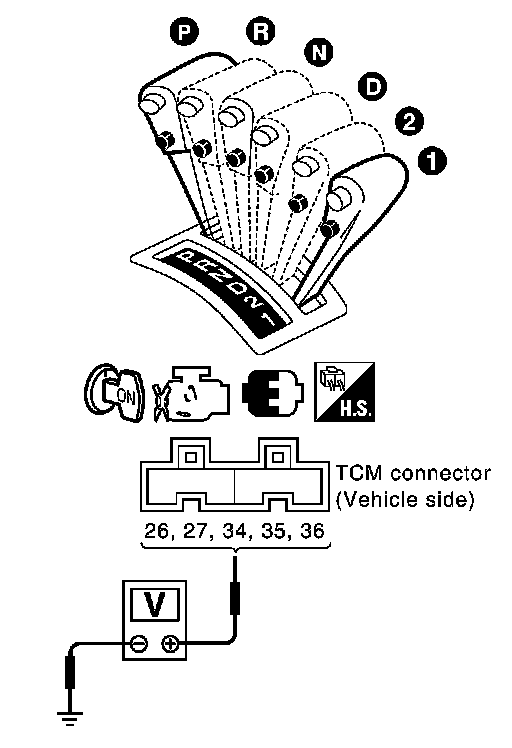 2.Check voltage between TCM connector terminals and ground while moving selector lever through each position. Transmission Range Switch A.