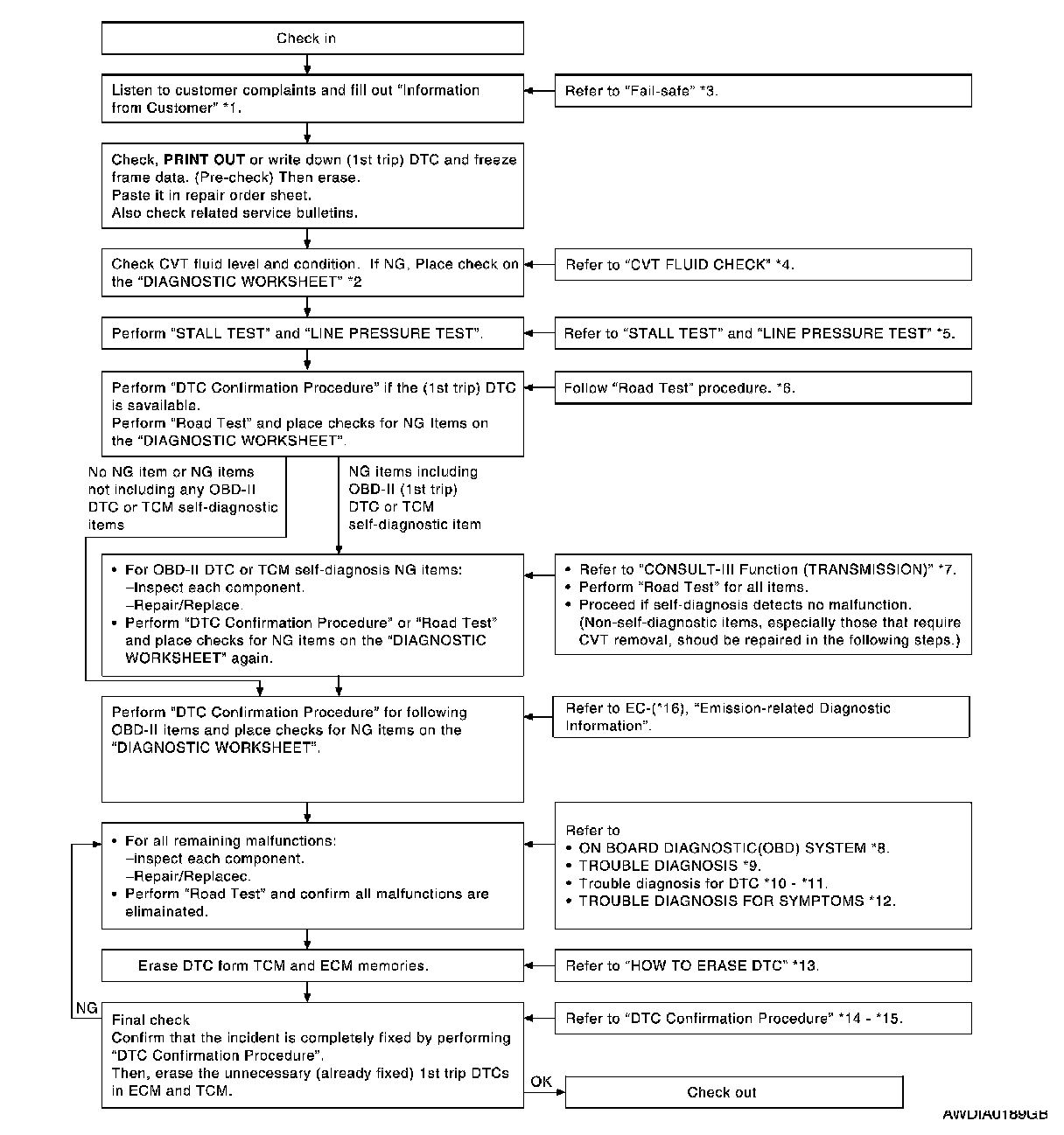 A visual check only may not find the cause of the errors. A road test with CONSULT (or GST) or a circuit tester connected should be performed. Follow the "WORK FLOW" .