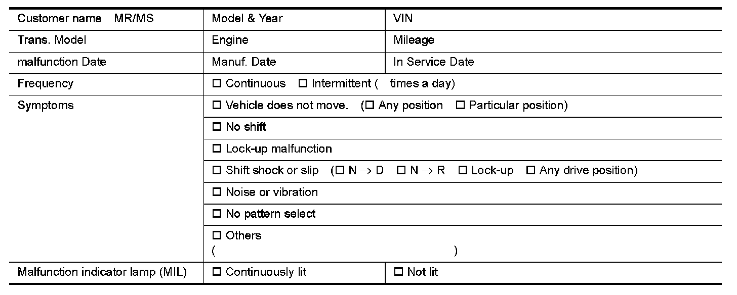 Before undertaking actual checks, take a few minutes to talk with a customer who approaches with a driveability complaint. The customer can supply good information about such errors, especially intermittent ones. Find out what symptoms are present and under what conditions they occur. A "DIAGNOSTIC WORKSHEET" as shown on the example (Refer to "Diagnostic Worksheet Chart" )