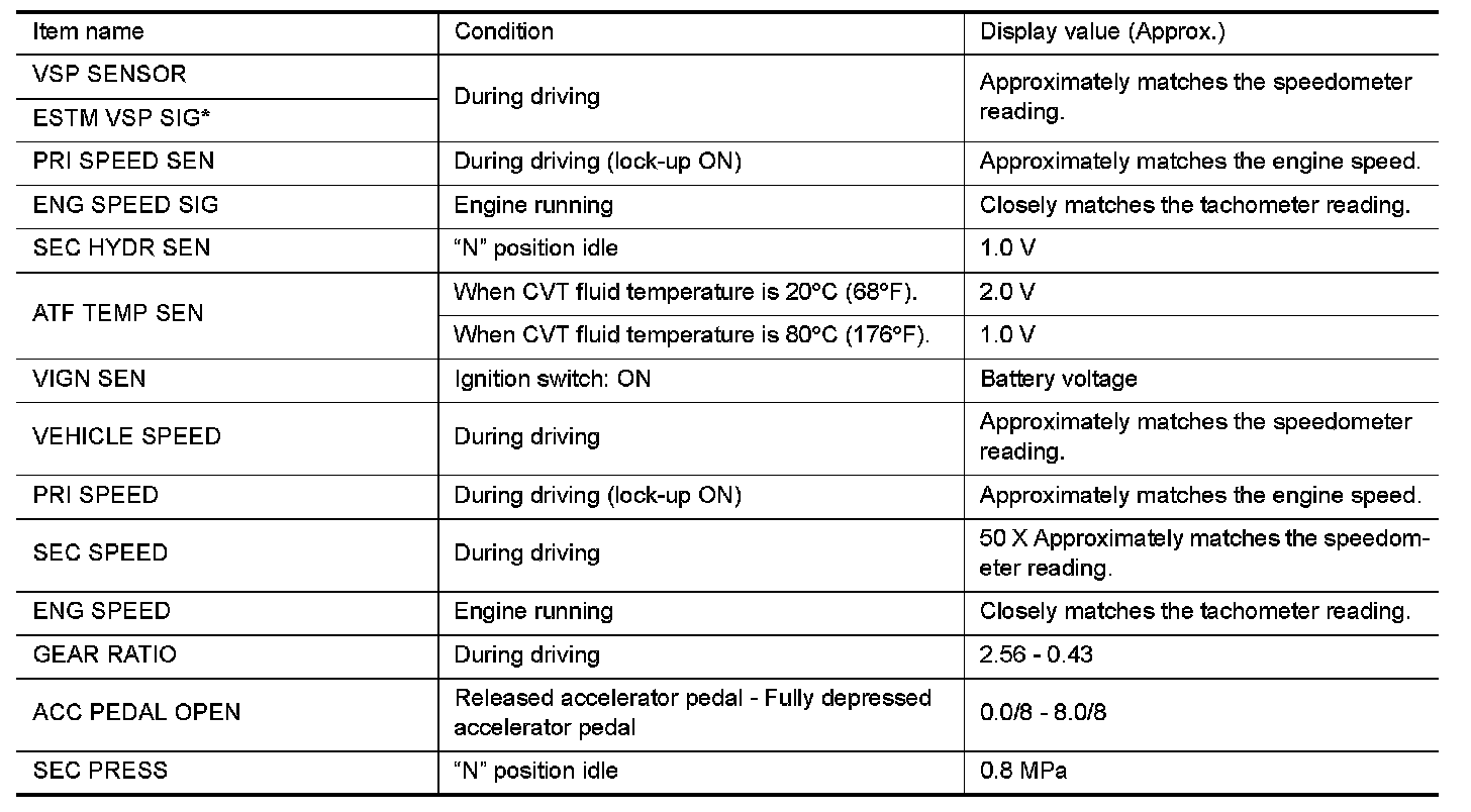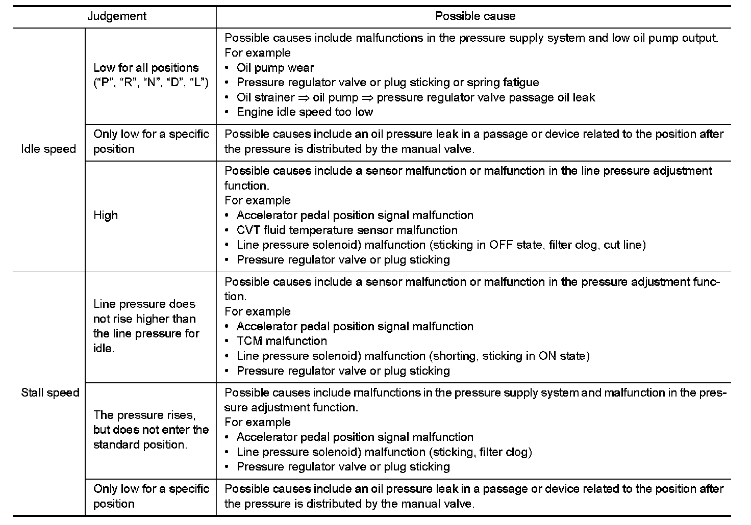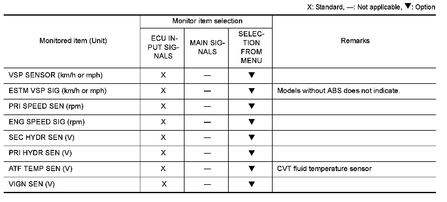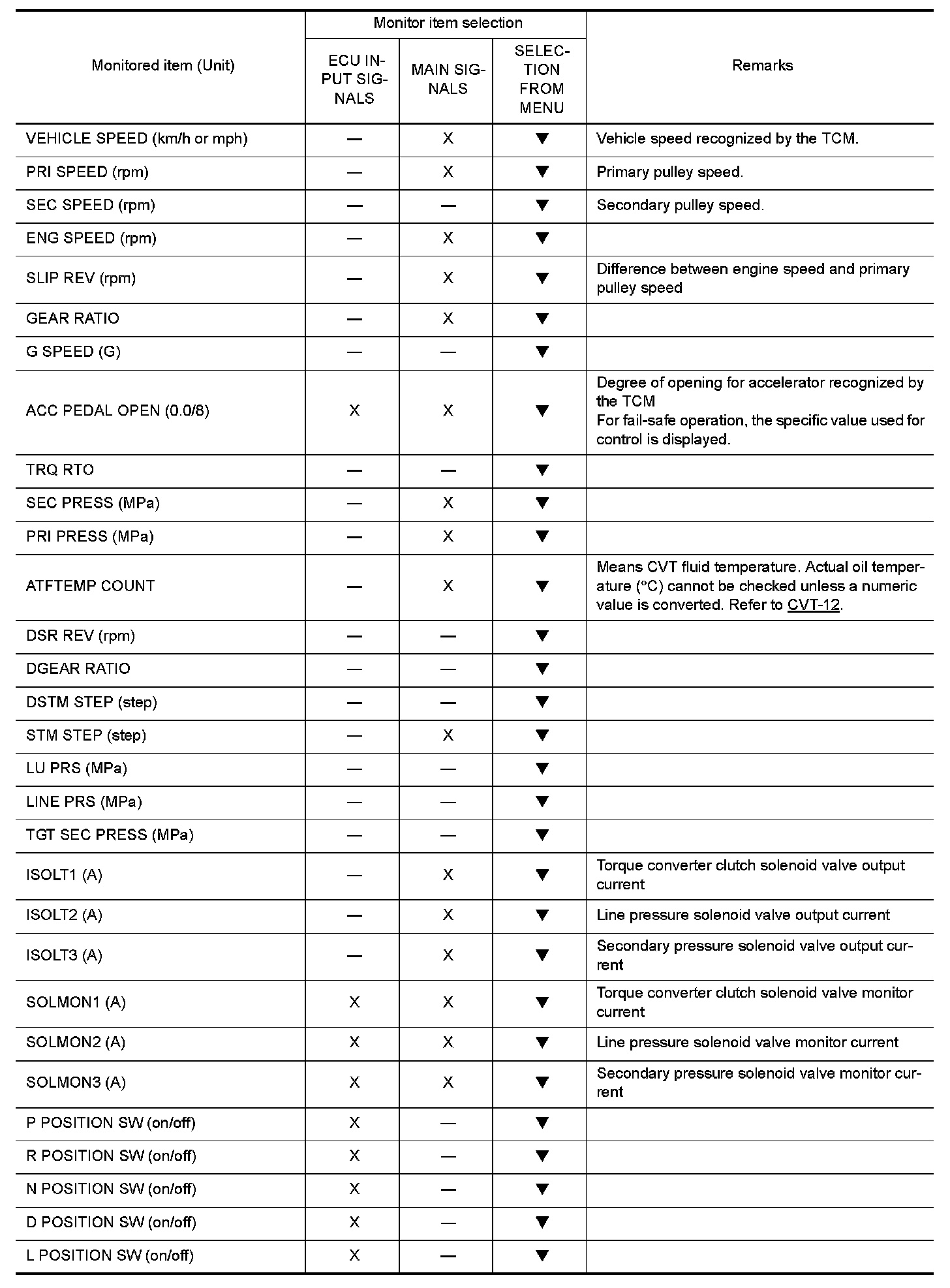 Input and output signals must always be correct and stable in the operation of the CVT system. The CVT system must be in good operating condition and be free of valve seizure, solenoid valve malfunction, etc.