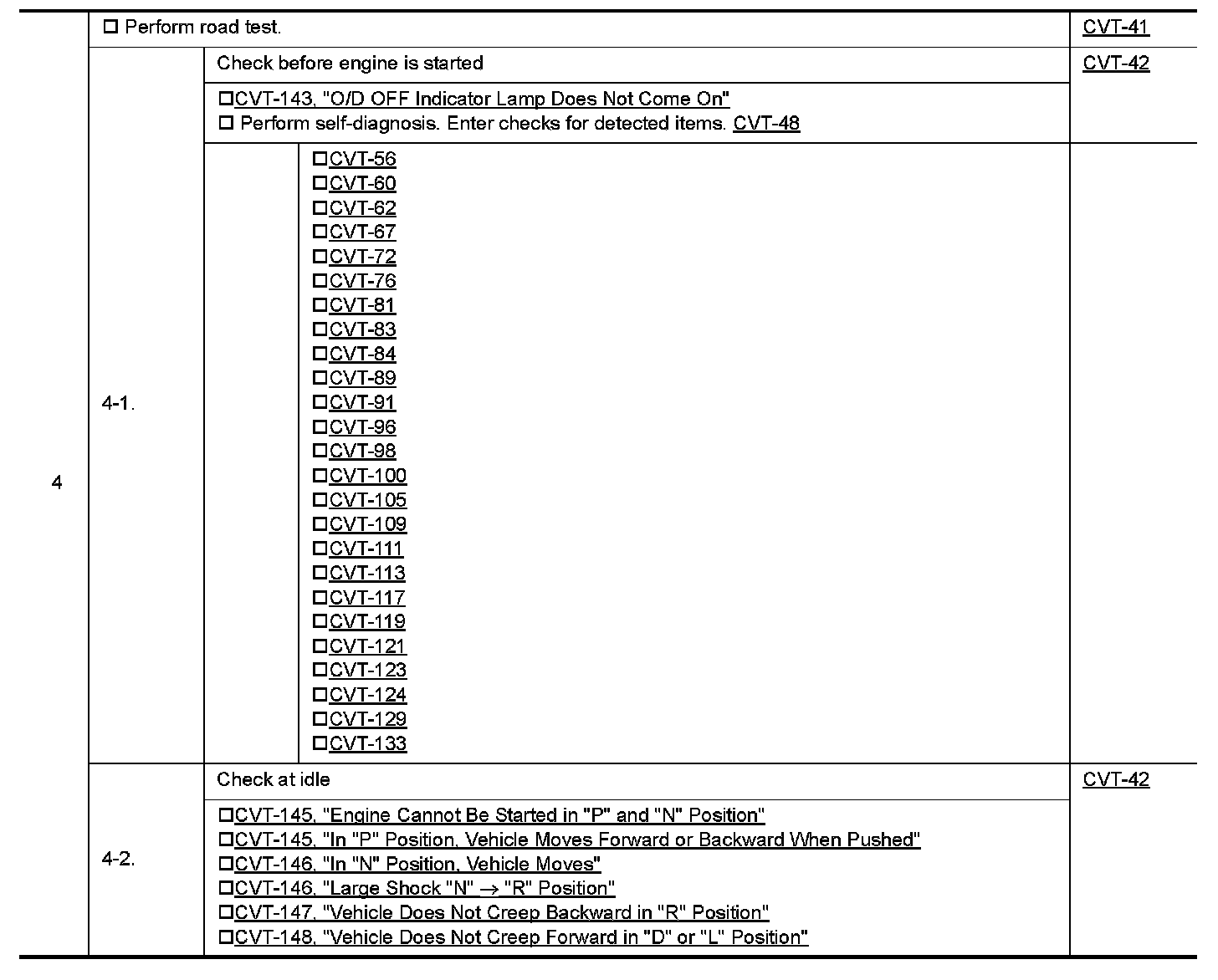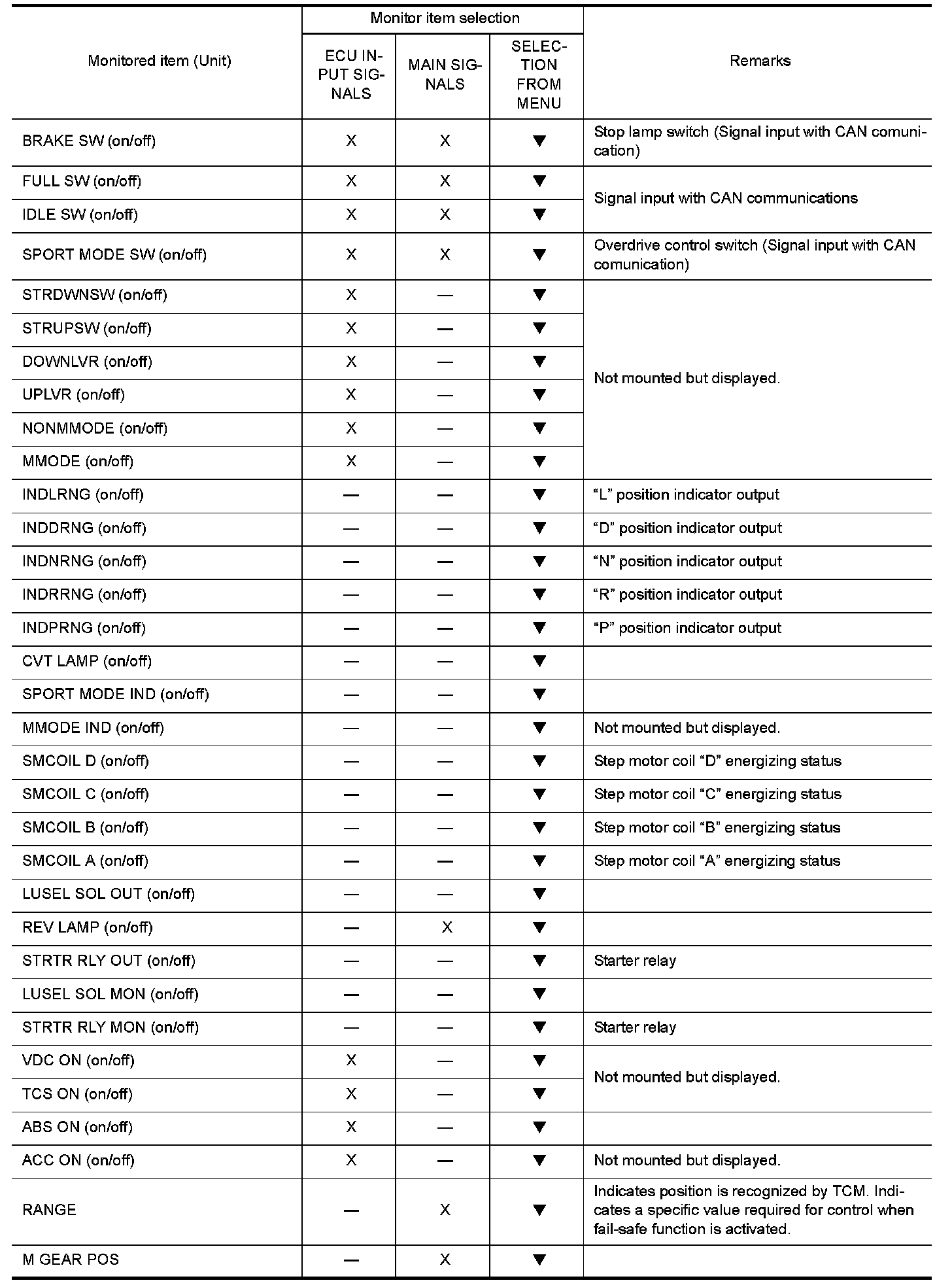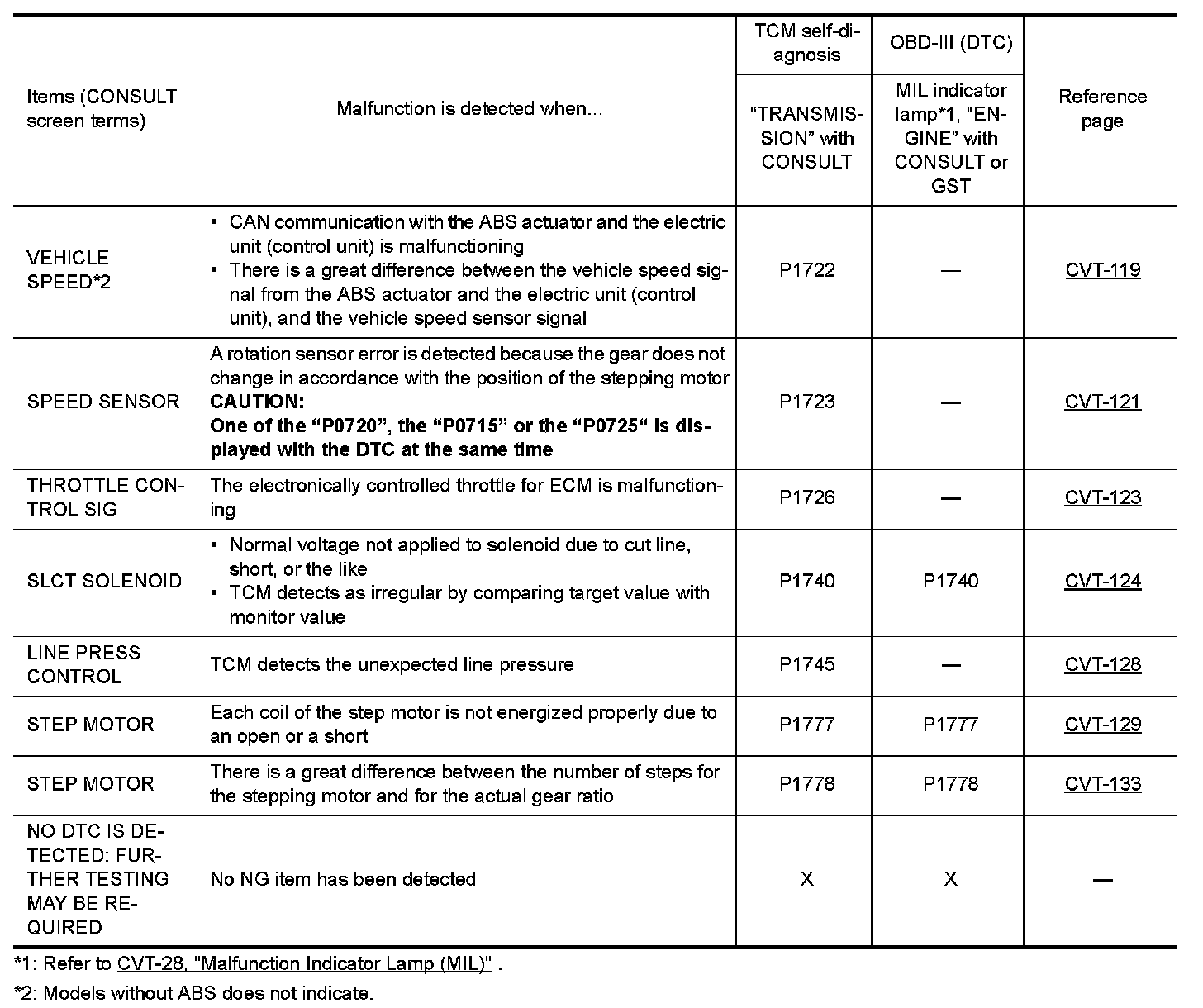 Input and output signals must always be correct and stable in the operation of the CVT system. The CVT system must be in good operating condition and be free of valve seizure, solenoid valve malfunction, etc.