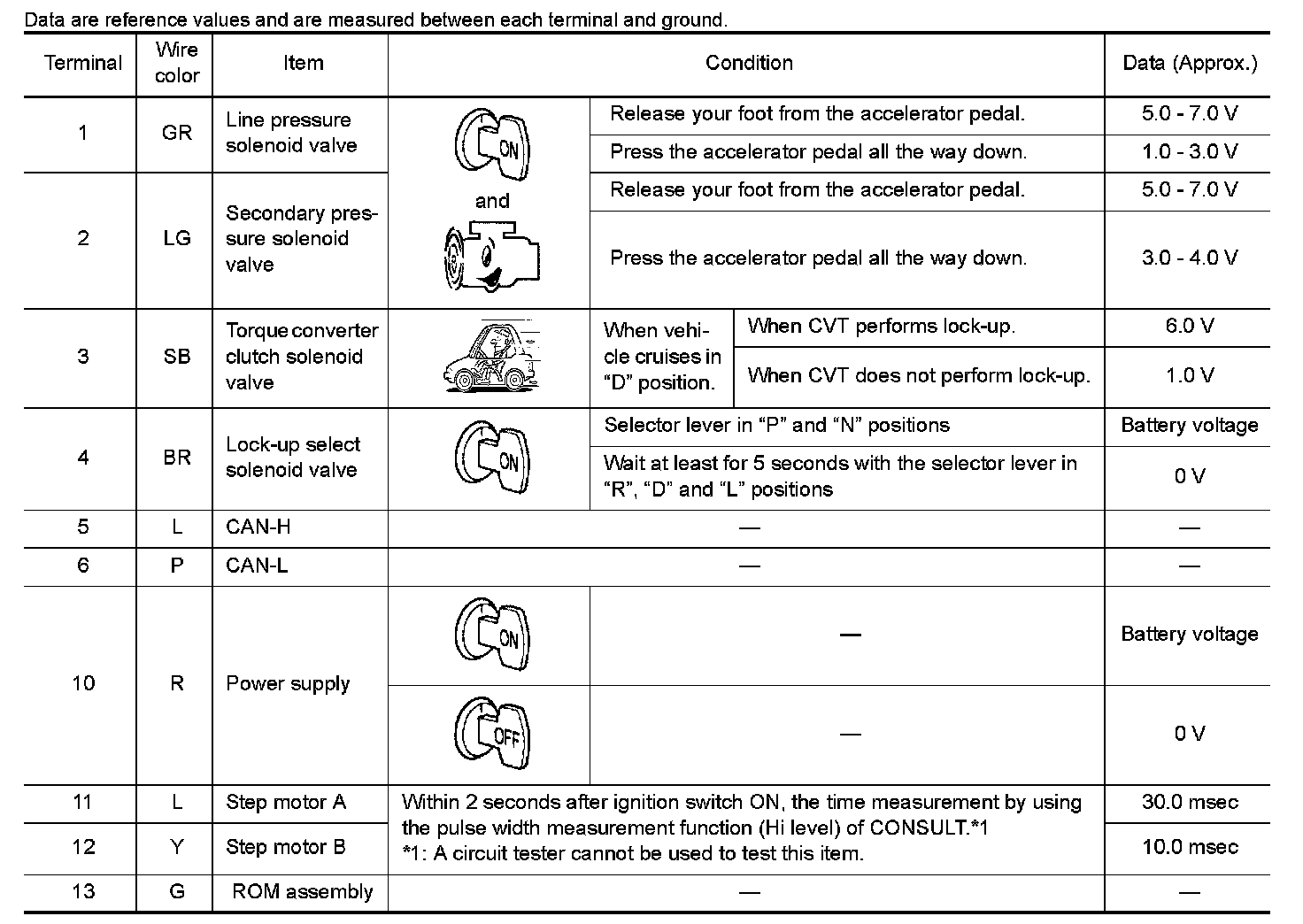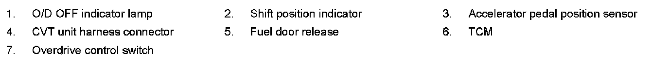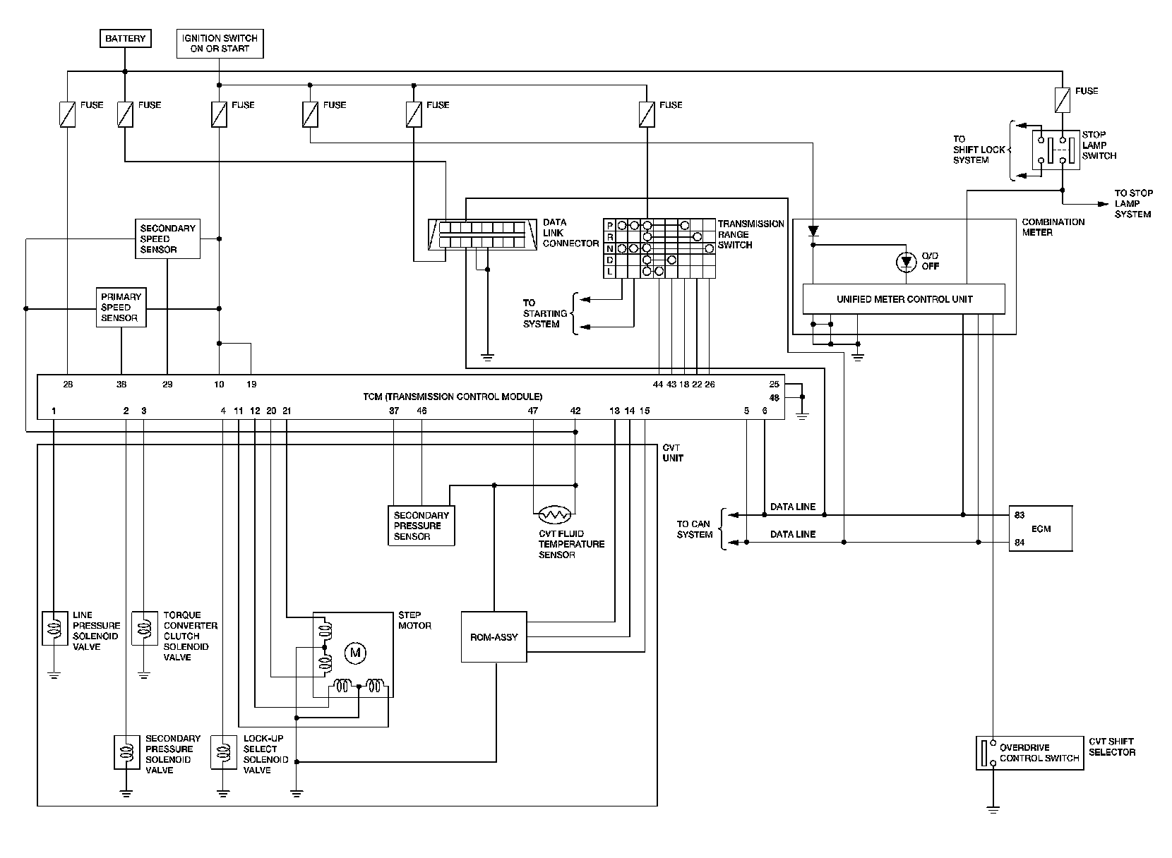 The TCM receives a signal from the vehicle speed sensor, transmission range switch and provides shift control or lock-up control via CVT solenoid valves.