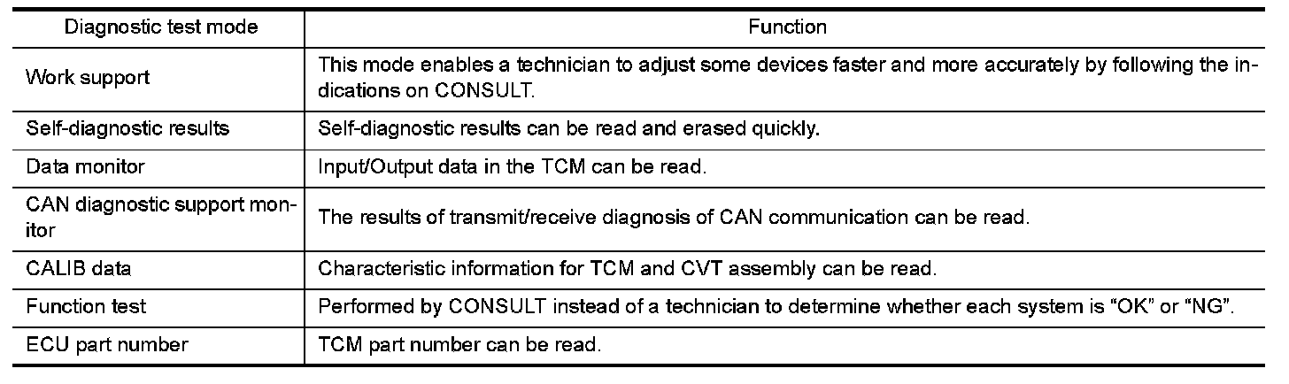 CONSULT can display each diagnostic item using the diagnostic test modes shown below.