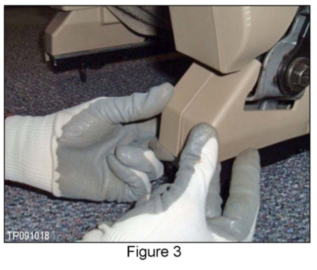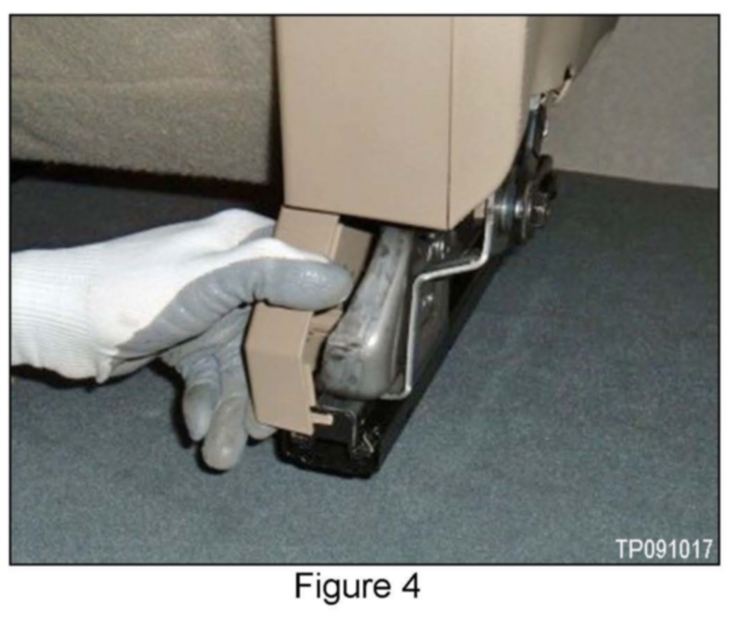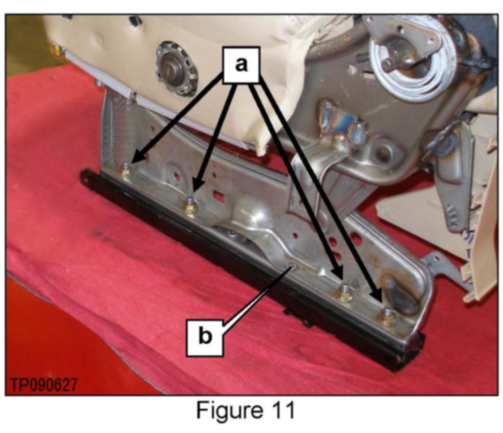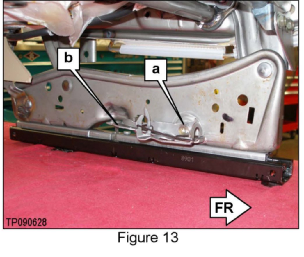 ^ If the seat cannot be moved fore / aft in order to access the seat bolts, depress both track's lock release levers at the same time. See a under "Install Service Kit", Figure 10 and b under "Attach Outer Handle Mounting Bracket Assembly", Figure 13 for lock release lever locations.