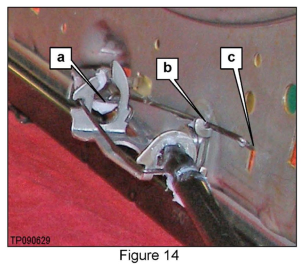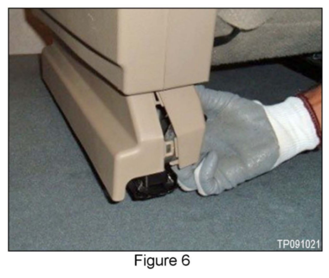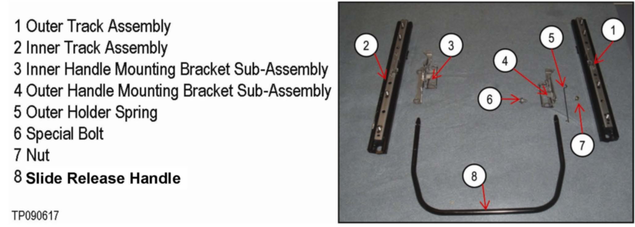 ^ If the seat cannot be moved fore / aft in order to access the seat bolts, depress both track's lock release levers at the same time. See a under "Install Service Kit", Figure 10 and b under "Attach Outer Handle Mounting Bracket Assembly", Figure 13 for lock release lever locations.