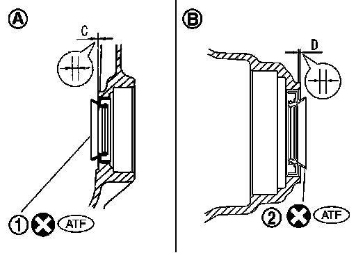 (1): LH differential side oil seal (2): RH differential side oil seal (A): Transaxle case side (B): Converter housing side