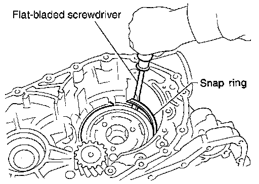 17.Install snap ring into transaxle case using a flat-bladed screwdriver.