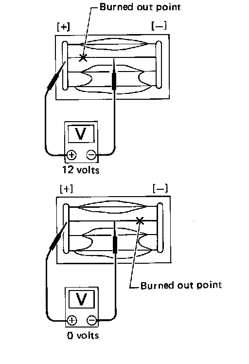 4.To locate burned out point, move probe to left and right along filament. Test needle will swing abruptly when probe passes the point.