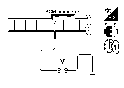 3.Check voltage between BCM connector M18 terminal 9 and ground.