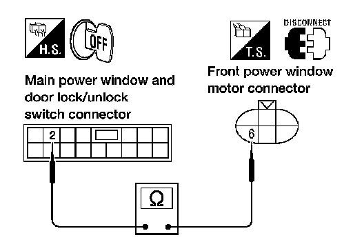 2.Check continuity between front power window motor LH connector D9 terminal 6 and ground.