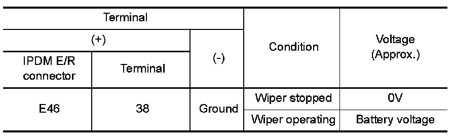 2.Check voltage between IPDM E/R connector and ground while front wiper motor is stopped and while it is operating.