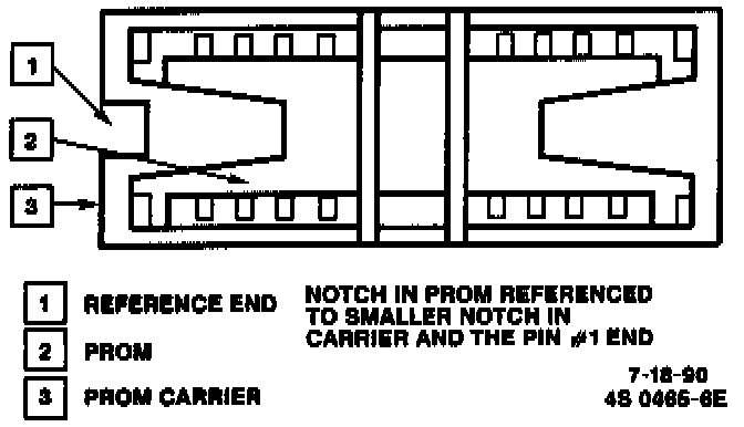 NOTE: Small notch of carrier should be aligned with small notch in socket. Press on PROM carrier until it is firmly seated in the socket. Do not press on PROM; only the carrier.