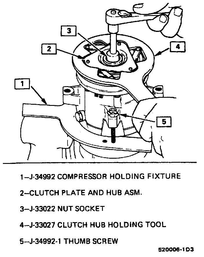 ^ If the center screw is threaded fully onto the end of the compressor shaft, or if the body of the installer is held and the center screw is rotated, the key will break the clutch hub.