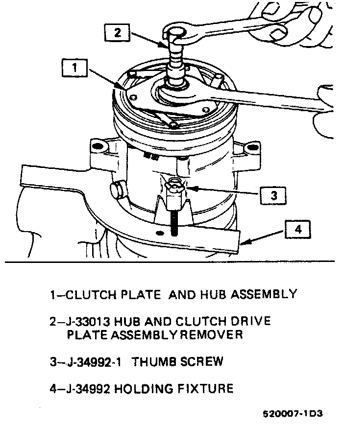 3. Thread the Clutch Plate and Hub Assembly Remover J-33013 into the hub. Hold the body of the remover with a wrench and turn the center screw into the remover body to remove the clutch plate and hub assembly.