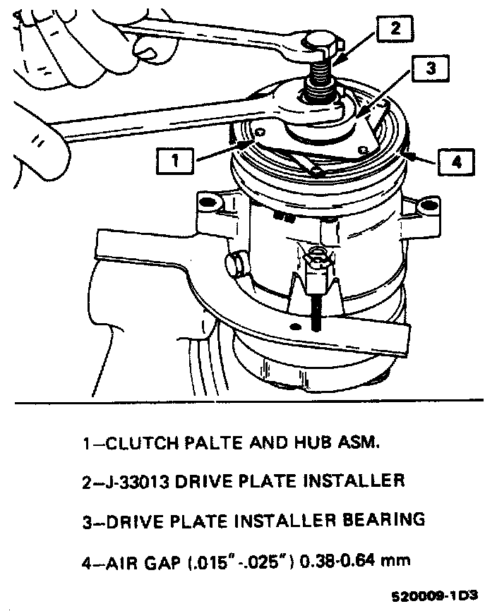 6. Hold the center screw with a wrench. Tighten the hex portion of the Installer J-33013 body to press the hub onto the shaft. Tighten the body several turns, remove the installer and check to see that the shaft key is still in place in the keyway before installing the clutch plate and hub assembly to its final position. The air gap between frictional surfaces of the clutch plate and clutch rotor should be 0.38-.064mm (0.015-0.025").
