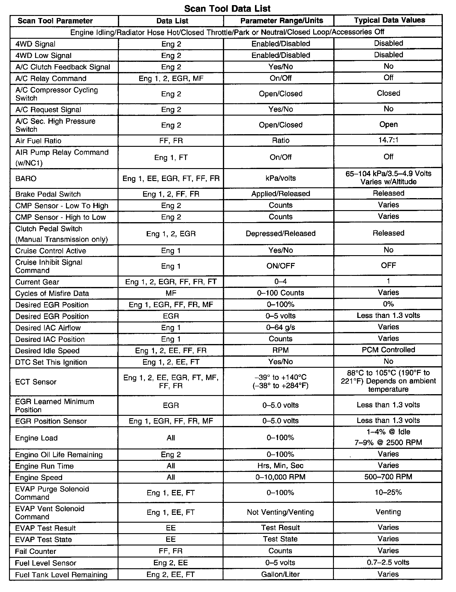 Scan tool values from a properly running engine may be used for comparison with the engine you are diagnosing. The Engine Scan Tool Data List represents values that would be seen on a normal running engine.