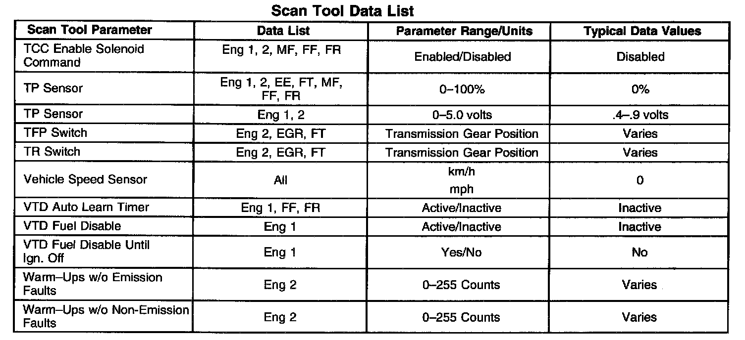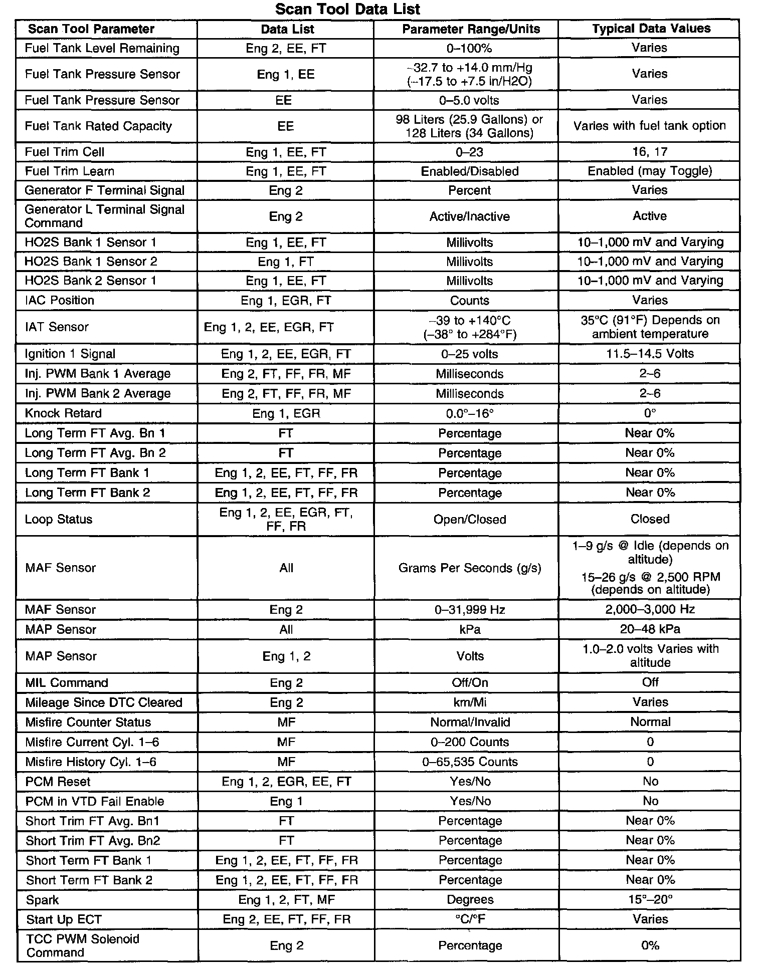 The Engine Scan Tool Data List contains all engine related parameters that are available on the scan tool. The list is arranged in alphabetical order. A given parameter may appear in any one of the data lists, and in some cases may appear more than once, or in more than one data list in order to group certain related parameters together.