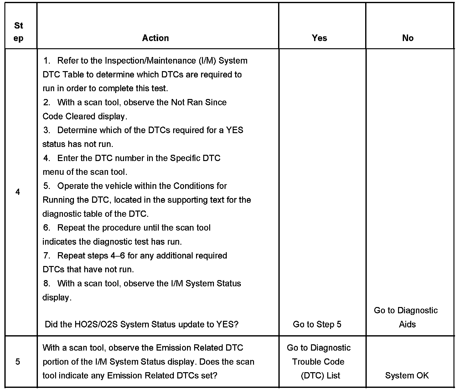 3. This step is to identify a first failure of a type B DTC. A DTC only appears on the I/M System Status display when it becomes a MIL illuminating DTC. This occurs on the second failure of a type B DTC. A first failure of a type B DTC will not allow the I/M System Status to update to YES. Refer to Diagnostic Aids.