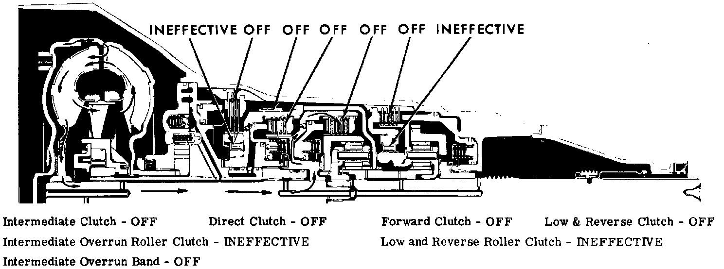 are released; therefore no power is transmitted from the turbine to the planetary gear sets or output shaft.