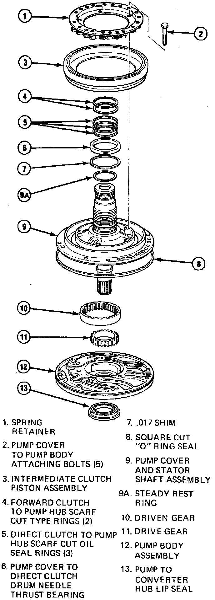 1. Remove oil seal rings and selective thrust washer from pump hub. Some models are equipped with needle thrust bearings.