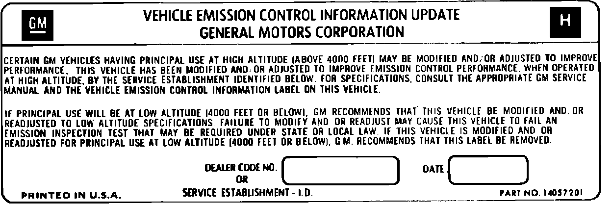 10. Fill in dealer code and date on the supplemental emission control label, part number 14057201 or equivalent (Figure 3). This label must be placed next to the existing underhood emission control information label. Wash off the area with soap and water, dry thoroughly, and apply the new label.
