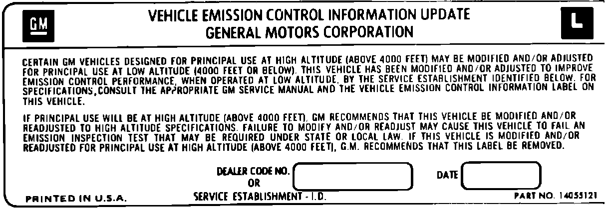 2. Fill in dealer code and date on the supplemental emission control label, part number 14055121 or equivalent (Figure 4). The label must be placed next to the existing underhood emission control information label. Wash off the area with soap and water, dry thoroughly and apply the new label.