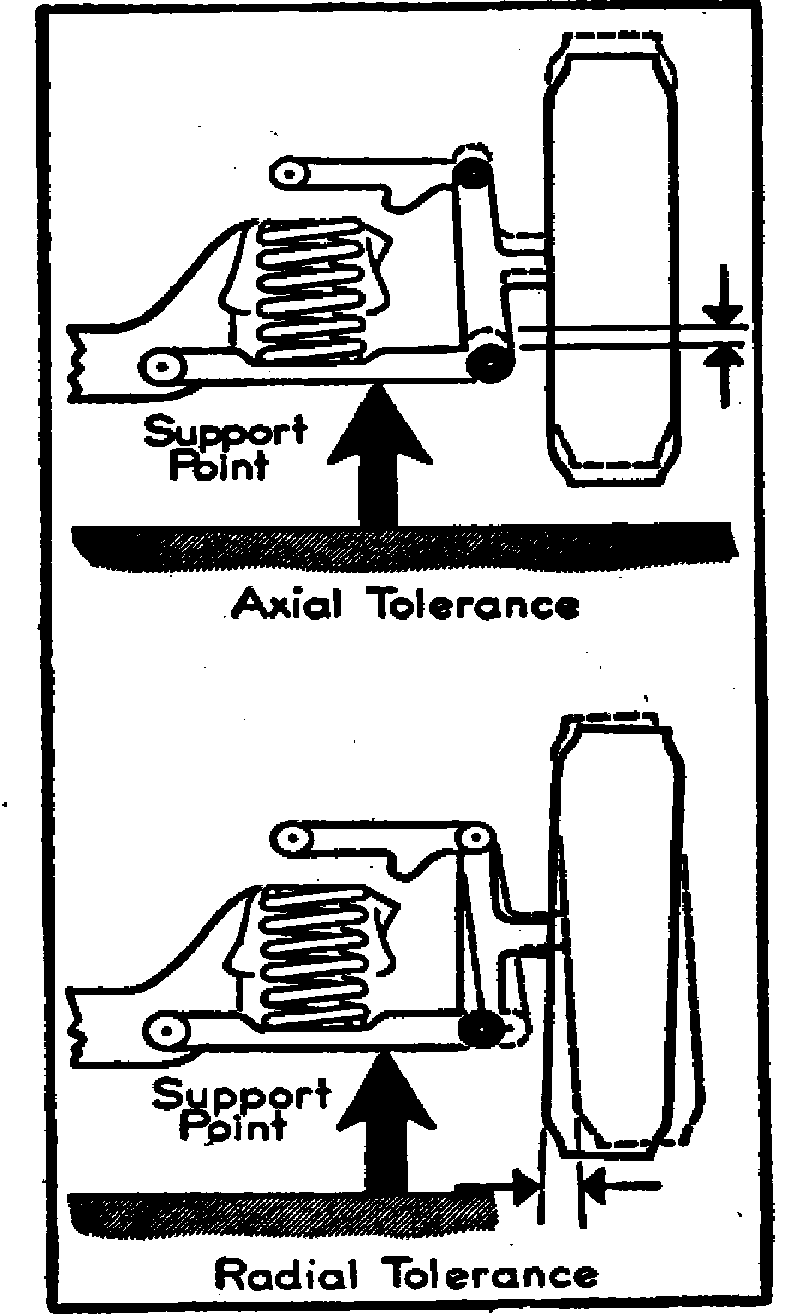 If loose ball joints are suspected, first be sure the front wheel bearings are properly adjusted and that the control arms are tight. Then check ball joints for wear as follows: Referring to Fig. 3, raise wheel with a jack placed under the lower control arm as shown. Then test by moving the wheel up and down to check axial play, and rocking it at the top and bottom to measure radial play.