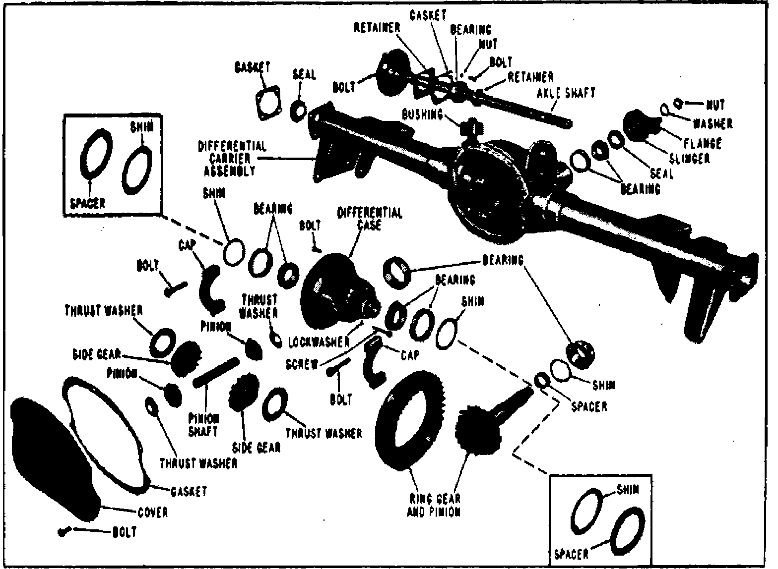 As shown in Fig. 2, the drive pinion is mounted on two tapered roller bearings that are preloaded by two selected spacers. The drive pinion is positioned by shims located between a shoulder on the pinion and the rear bearing. The front bearing is held in place by a large nut. The differential is supported in the carrier by two tapered roller side bearings. These are preloaded by inserting shims between the bearings and the pedestals. The differential assembly is positioned for ring gear and pinion backlash by varying these shims.