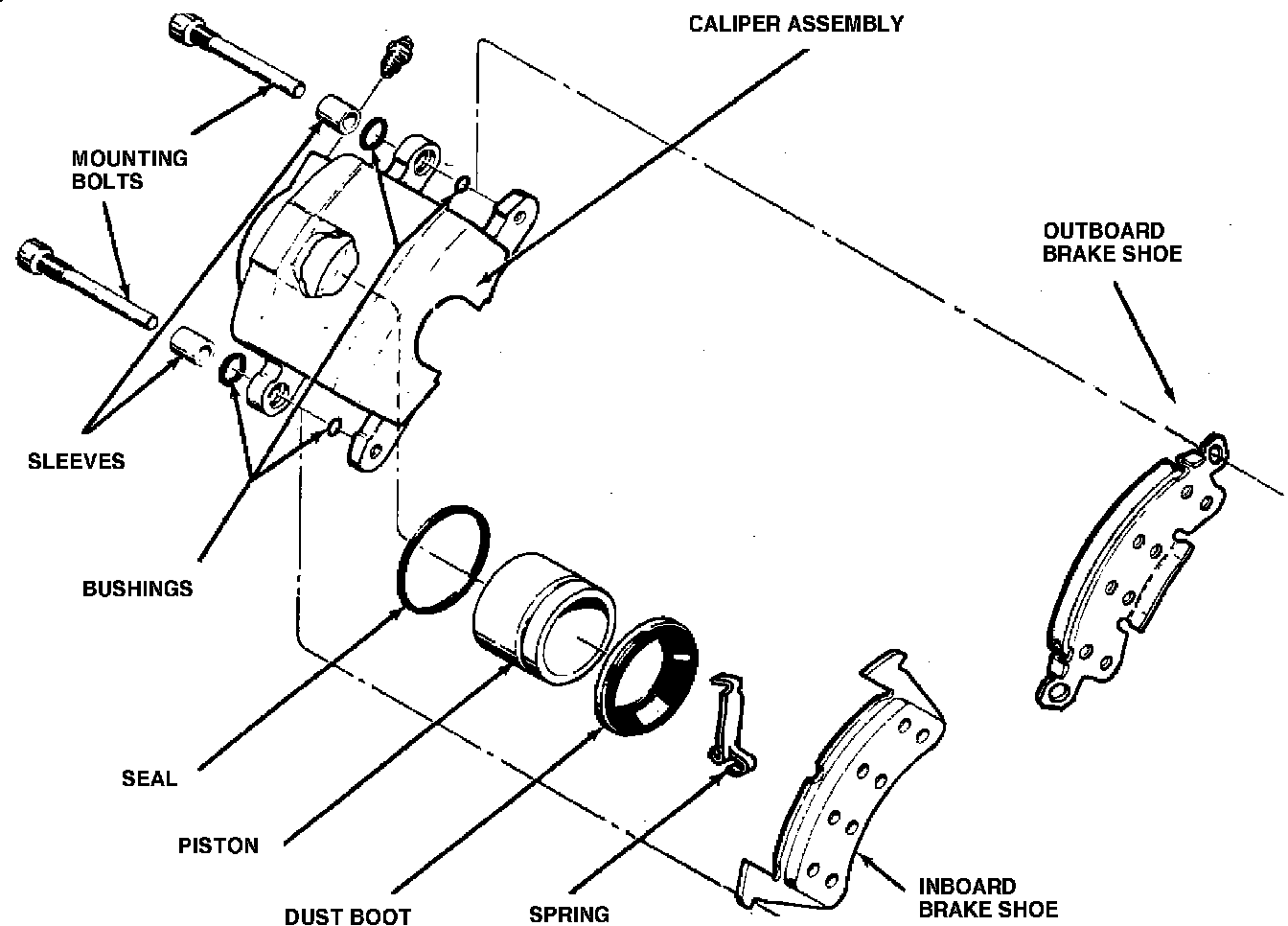 The caliper assembly slides on the mounting bolts. Upon brake application, fluid pressure against the piston forces the inboard shoe and lining assembly against the inboard side of the disc. This action causes the caliper assembly to slide until the outboard lining comes into contact with the disc. As pressure builds up, the linings are pressed against the disc with increased force.