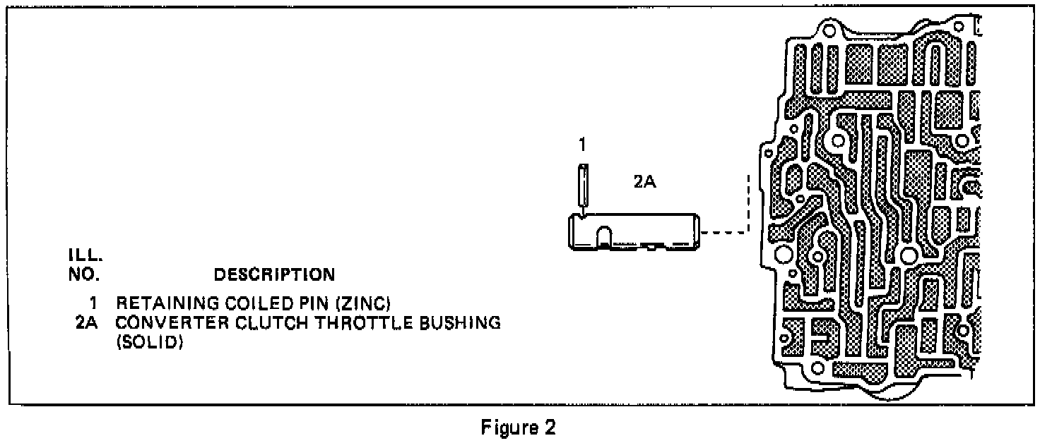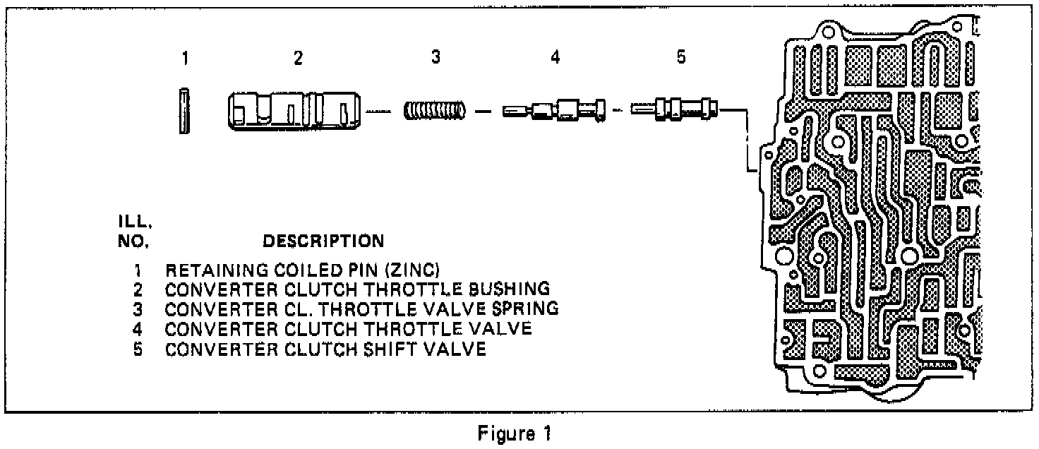 Beginning late in the 1982 model year, the THM 200-4R transmission control valve assemblies were changed to eliminate the Torque Converter Valve Train (Figure 1). The computer command control unit (C-3) controls the converter clutch making the T.C.C. Valve Train unnecessary. The new control valve assembly (Figure 1), will have a solid bushing in it to direct oil flow.