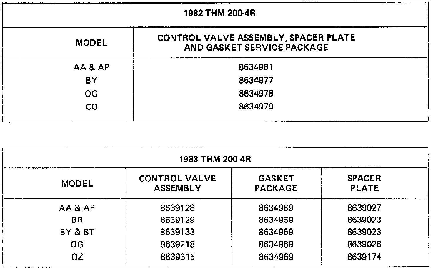 When servicing any 1982 or 1983 THM 200-4R transmission that has a C-3 system (all except diesel and Canadian models), it is important that the proper spacer plate and gaskets be used. Refer to the charts for proper usage.