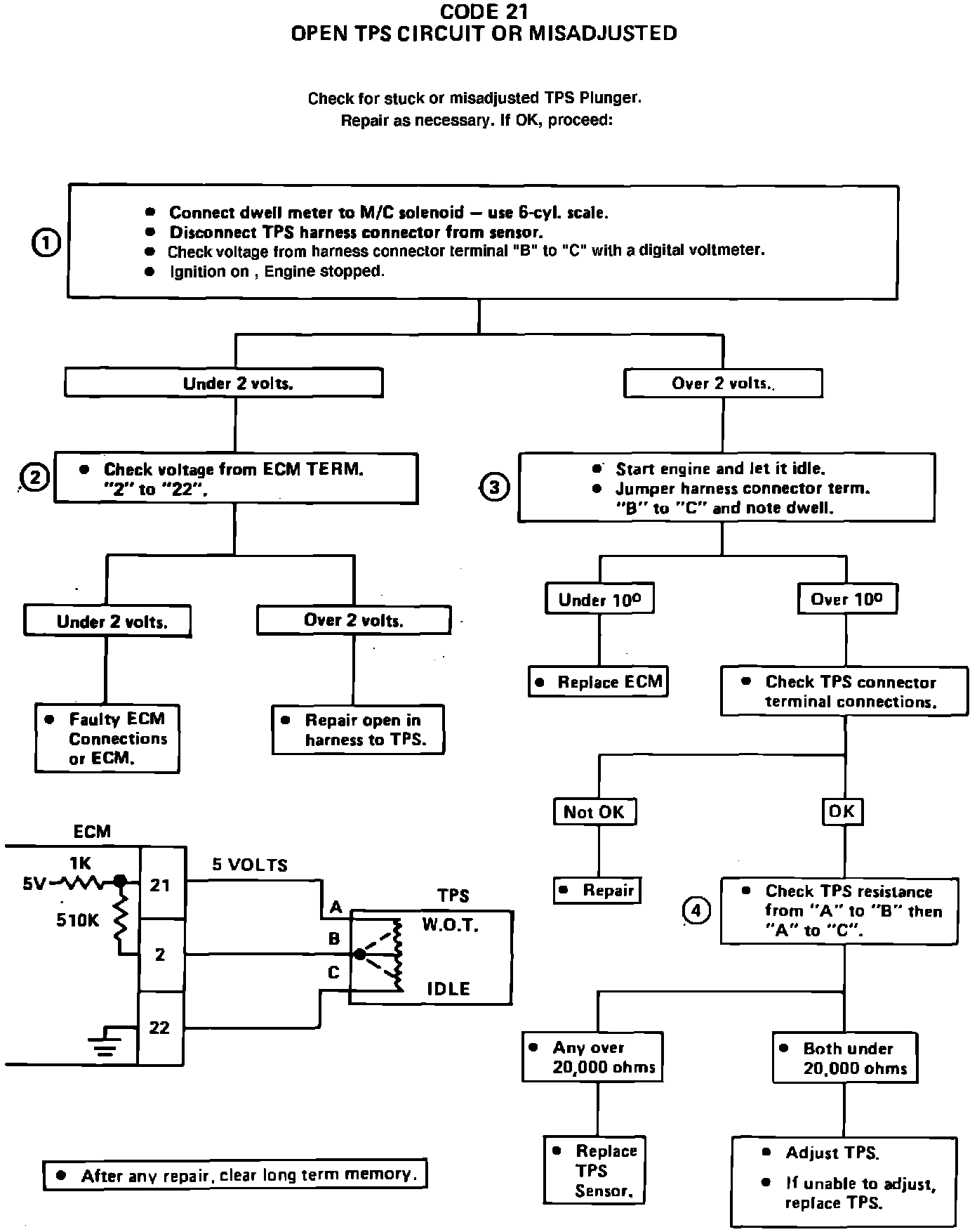 1. Checks the circuits from the TPS connector back to the ECM. Both wires should read about 5V because of the pull-up resistor in the ECM. A 10 Meg. ohm resistance meter must be used. A lower resistence voltmeter would read virtually zero at terminal B.