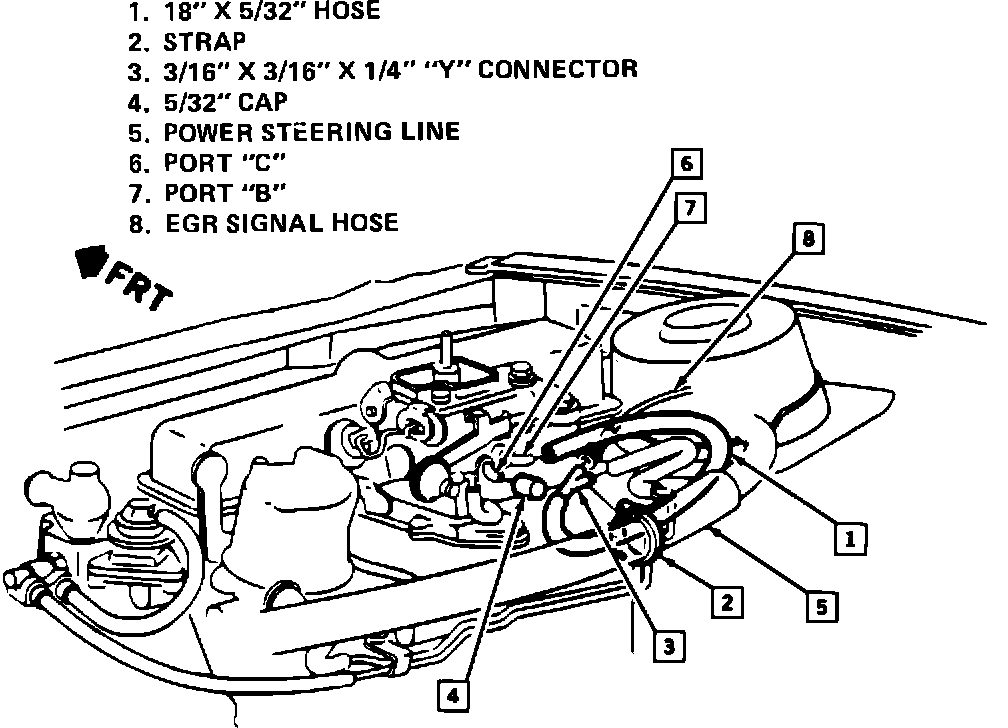 f. Strap the new emission hose to the power steering line or engine wiring harness to prevent it from moving around.