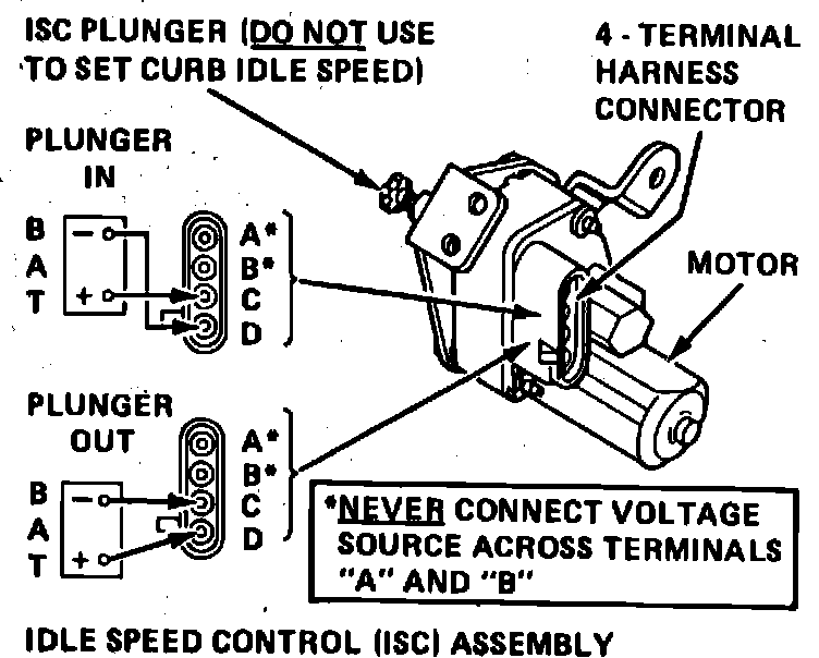 NOTE: Do not leave battery voltage connected to ISC motor longer than necessary to retract solenoid plunger. Do not connect battery voltage to terminals "A or B" on motor. ISC motor will be damaged if connections are improperly made.