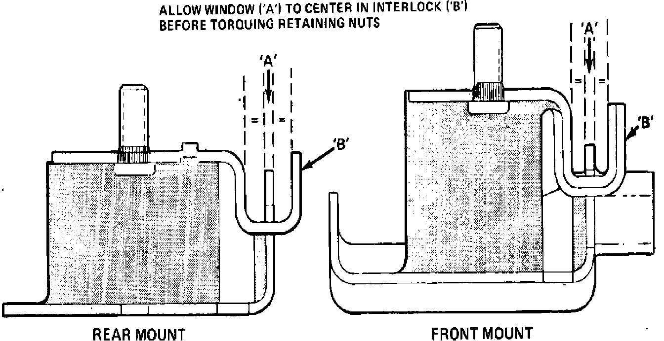 3. Reverse procedure to install, then lower engine into position. Install retaining nuts and torque to 35 ft. lbs. After engine mount is properly installed, check both transaxle mounts for proper alignment. If window ``A'' is not properly located, Fig. 4, loosen mount to cradle retaining nuts and allow mount to reposition itself. If transaxle mount is allowed to remain out of position, damage to drive train components may result. Torque retaining nuts to 18 ft. lbs.