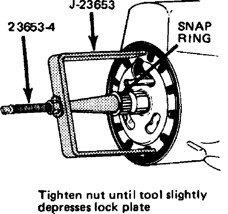 4. Using lock plate compressing tool J-23653, compress lock plate and pry snap ring from groove on shaft, Fig. 8. Slowly release lock plate compressing tool, remove tool and lock plate from shaft end.