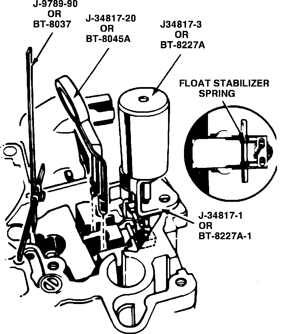 2. Attach base tool J-34817-1 or BT-8227A-1 to float bowl, Fig. 8.