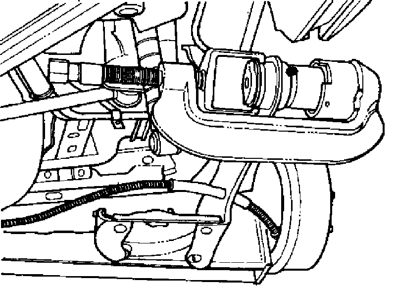1. Raise rear of vehicle and support rear axle under front side of spring seat using a suitable jack.