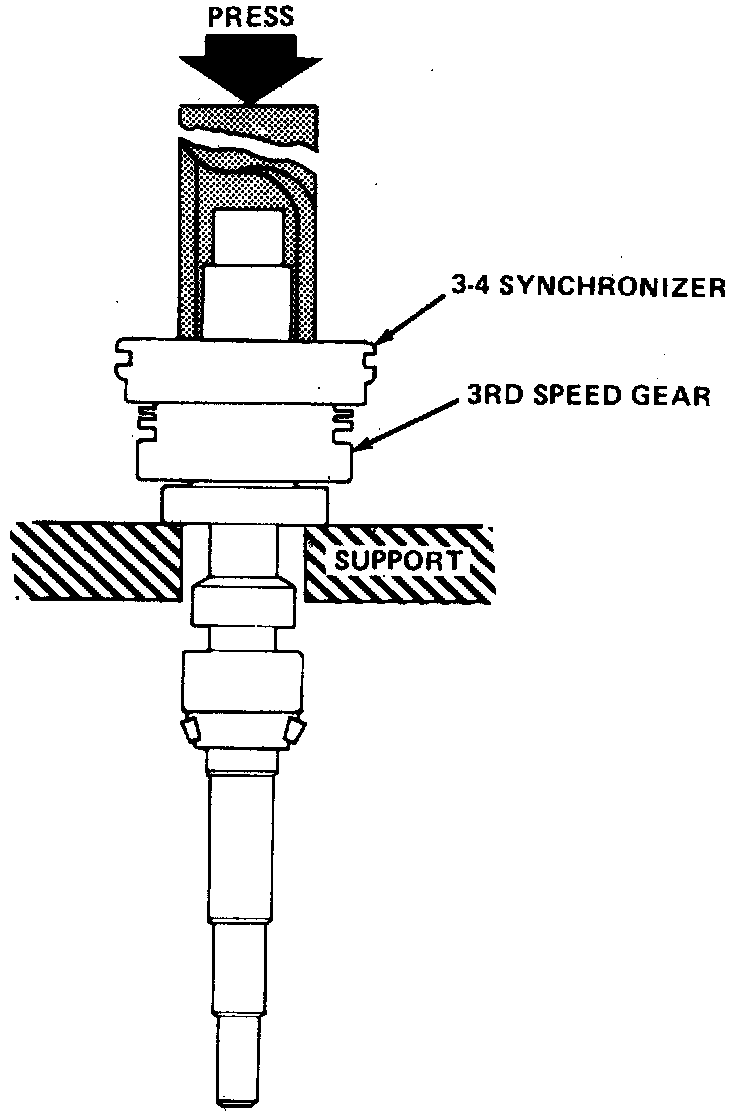 2. Position 3rd gear on input shaft. Install blocking ring onto gear cone, then press 3-4 synchronizer onto shaft using a length of pipe of suitable diameter or other suitable tool. Do not press on sleeve portion of synchronizer, press on hub near shaft