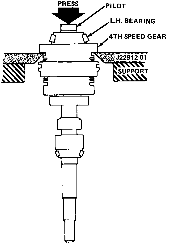 1. Using tool No. J-22912-01 in 4th gear roove, press 4th gear and bearing from input shaft. On 1982-85 models, the 4th gear and bearing will slide off the input shaft.
