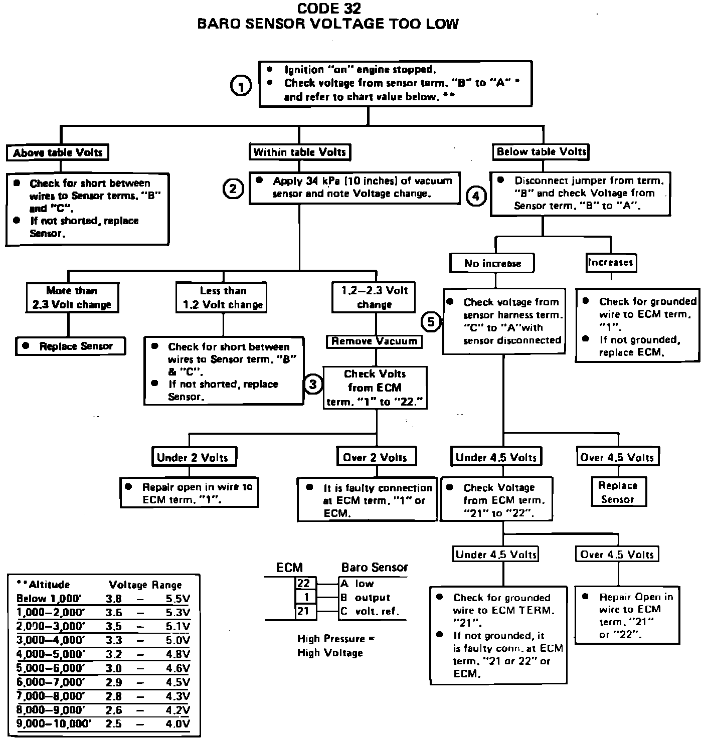 Code 32 says that the ECM has seen BARO pressure (measured in volts) too low at Term. "1" of the ECM.