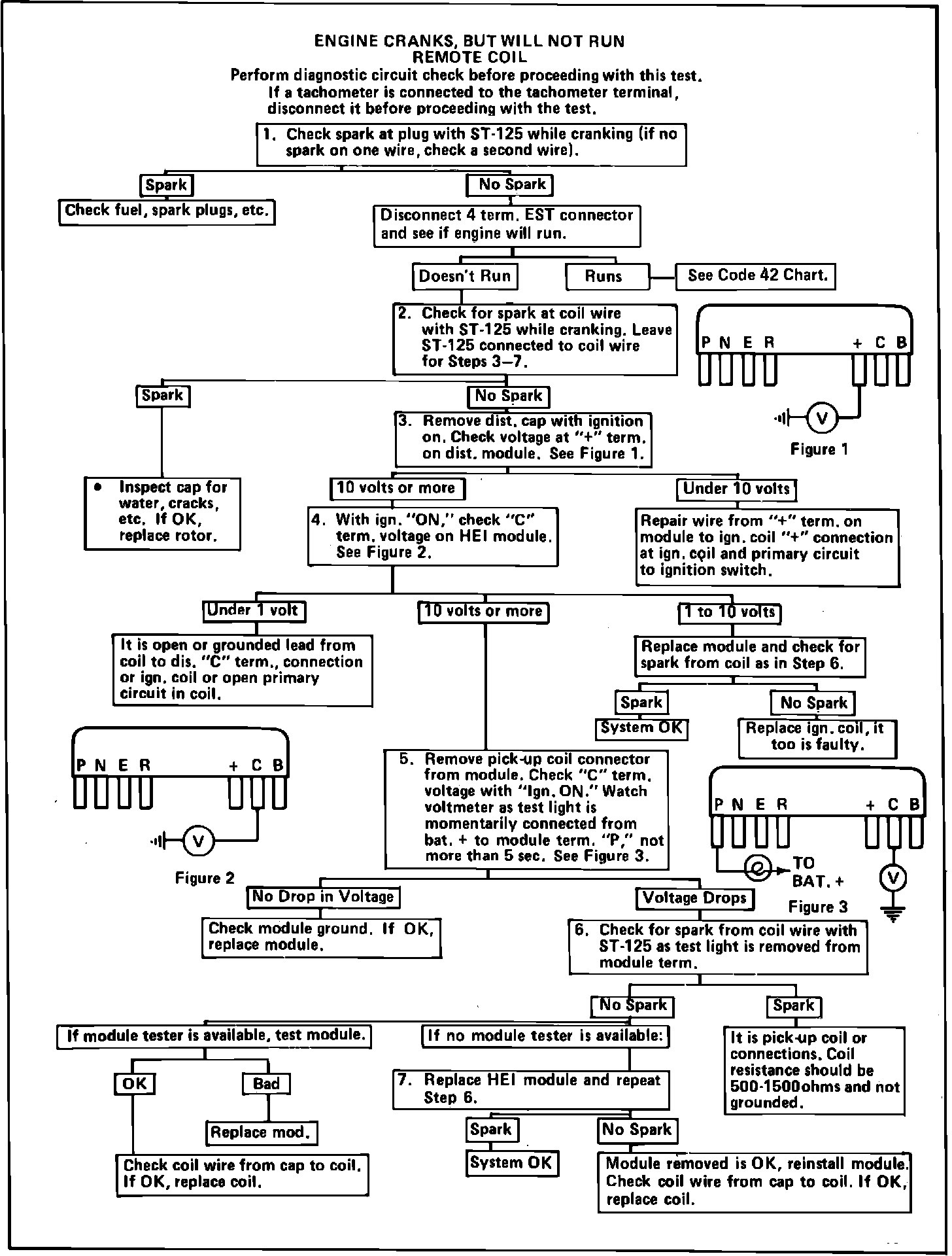 6. This should turn "OFF" the module and cause a spark. If no spark occurs, the fault is most likely in the ignition coil because most module problems would have been found before this point in the procedure. A module tester could determine which is at fault.